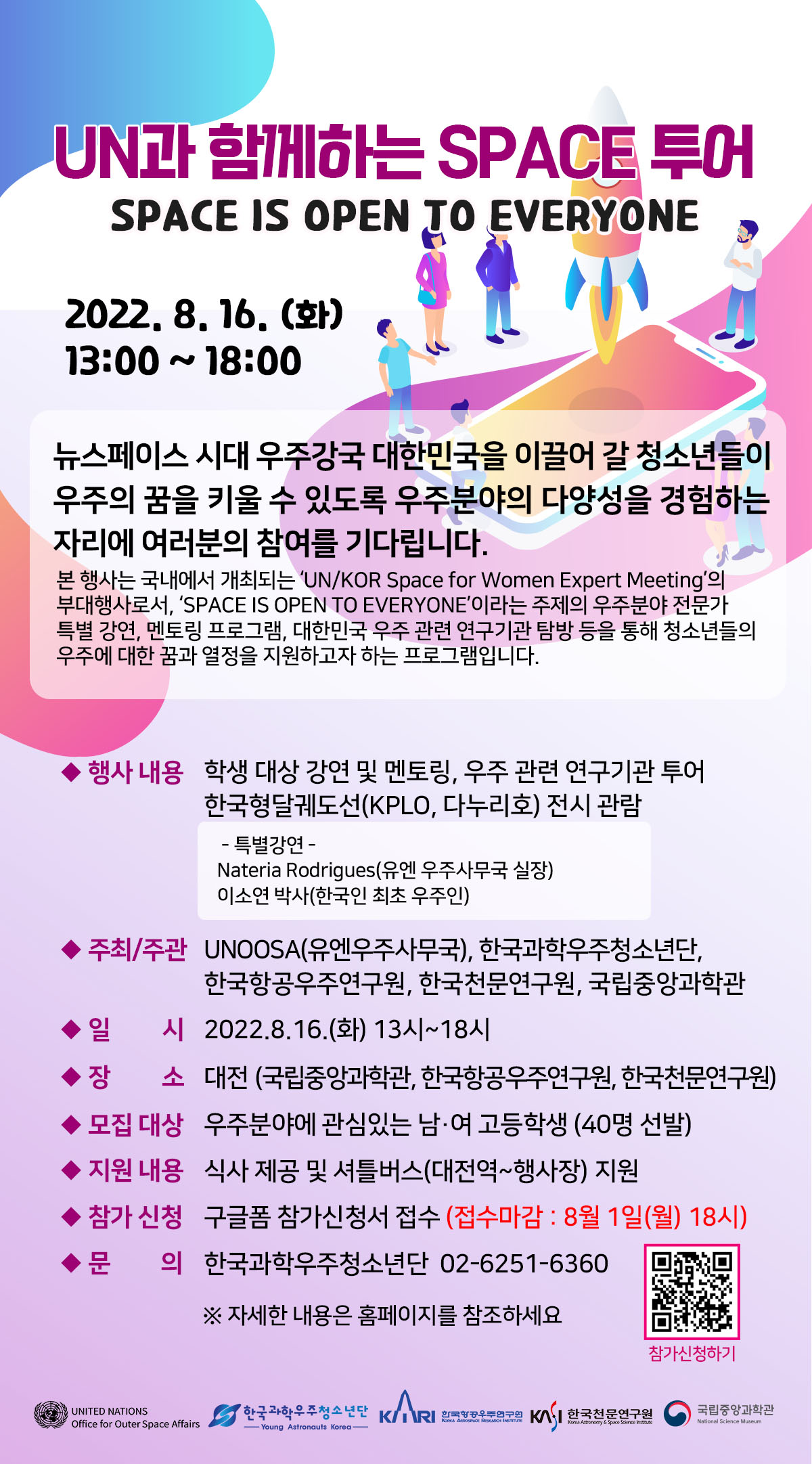 ○ 주최 및 주관 : UNOOSA(유엔우주사무국), 한국과학우주청소년단(YAK), 한국항공우주연구원, 한국 천문연구원, 국립중앙과학관 ○ 일 시 : 2022. 8. 16. (화) 13:00 ~ 18:00 ○ 장 소 : 대전 (국립중앙과학관, 한국항공우주연구원, 한국천문연구원) ○ 내 용 : 학생 대상 특별 강연, 멘토링, 우주 관련 연구기관 투어 및 한국형달궤도선(KPLO, 다누리호) 전시 관람 ○ 대 상 : 우주분야에 관심 있는 남녀 고등학생 40명 선발 ○ 방 법 : 한국과학우주청소년단 홈페이지(yakedu.or.kr) 접속 → 공지사항→ 「UN과 함께하는 SPACE 투어」클릭 후, 구글폼 참가신청서 접수 ○ 접수마감 : 8월 1일 (월) 18시 ※ 선정 결과 발표 : 8월 5일 (금) 개별연락 ○ 문 의 : 한국과학우주청소년단 02-6251-6360