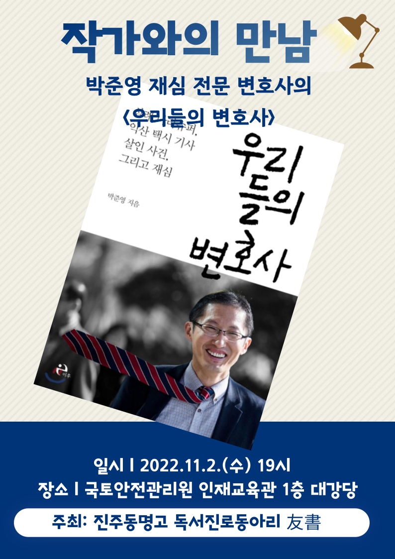 1. 일시: 2022년 11월 2일(수) 저녁 7시 2. 장소: 국토안전관리원 인재교육관 1층 대강당(진주시 사들로 131 혁신도시 LH 뒤편) 3. 강사: 박준영 변호사(자세한 강사 소개는 붙임 파일 참조) 4. 도서: '우리들의 변호사'(박준영 지음) 5. 함께 읽으면 좋은 책: '지연된 정의'(박상규 지음) 6. 참가신청방법: 1학년은 진로와직업 수업시간에 신청을 받음. 2학년은 10월 11일(화) 방송으로 신청을 받음. 또는 4층 커리어존 강원구 선생님께 직접 신청할 것. 7. 도서구입 방법: 도서구입은 진주문고에서 하면 10% 할인 및 진주문고 회원의 경우 5% 적립됩니다. 8. 기타 사항: 작가와의 만남이므로 반드시 책을 읽고 참석합니다.