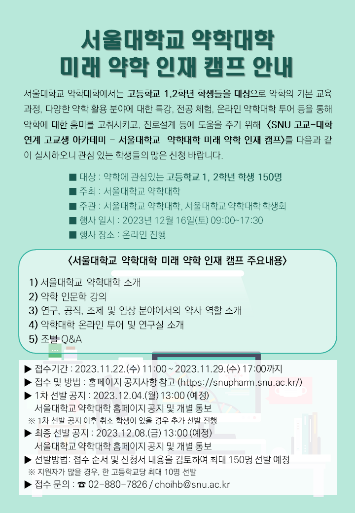 서울대학교 약학대학 미래 약학 인재 캠프 안내